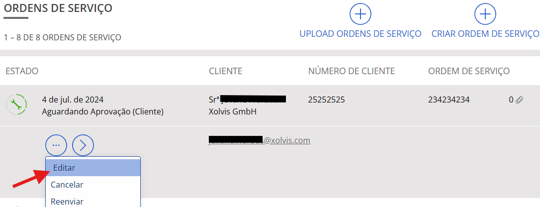 Você pode modificar os dados do cliente, do veículo, adicionar anexos e fazer outras edições clicando em "Editar".